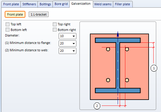 Here you can choose whether you want to apply bores for galvanization to the front plate and first profile. Activate the corresponding checkboxes and enter the desired diameter. In addition , you can specify a minimum distance of the bores to the flange and to the web.