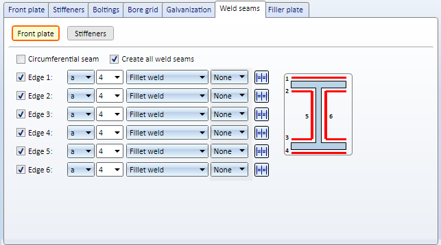 On this tab you can choose, by activating the corresponding checkboxes, which weld seams are to be created: