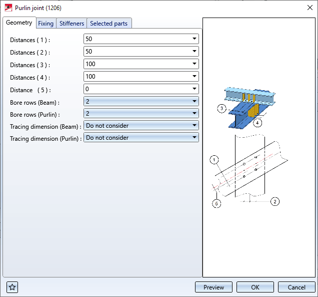 Possible are up to 2 bore rows on girder and purlin. Select the desired number of bore rows from the corresponding list box. The value (1) determines the distance of the bolts to the purlin axis, the value (2) determines the distance of the bolts to the girder axis. If there are more than 1 bore rows you can additionally specify an offset (5) of the bolting relative to the purlin axis. The value (3) and (4) determine the distance between the stiffeners on the girder and the purlin.