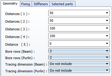 On this tab you specify the dimensions of the purlin joint. These refer to the boltings and the distances between the stiffeners.