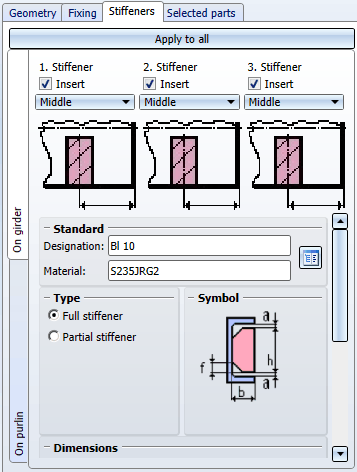 Up to 3 stiffeners can be inserted on the purlin and on the girder. To do this, activate the Insert checkbox. For each stiffener you can specify the edge to be relevant for insertion: Front side, back side or middle. The distance entered on the Geometry tab will then be used for the settings that you specify here. One example: Let us assume that you insert three stiffeners and select Middle, Back side, Front side. On the Geometry tab you have selected a distance of 75. The stiffeners will then be inserted in such a way that the distance from the back side of the second stiffener to the middle of the first stiffener, and the distance from the front side of the third stiffener to the back side of the second stiffener will have the specified value.