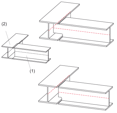 You use the functions of the Notch menu to connect one beam to another by cutting areas of the beam to fit ("notching"). The beam to be connected is assigned a notch in the process. This can be done with or without lengthening the beam to be connected. You can use the existing notch parameters or set new ones.