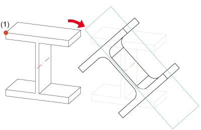 The Align function rotates the beam in relation to a 3-D point to be specified. Choose the Align button. Then, specify a 3-D point in web direction. The beam is rotated so that its web lies in the plane that can be formed by the 3-D point and the "original" beam axis.