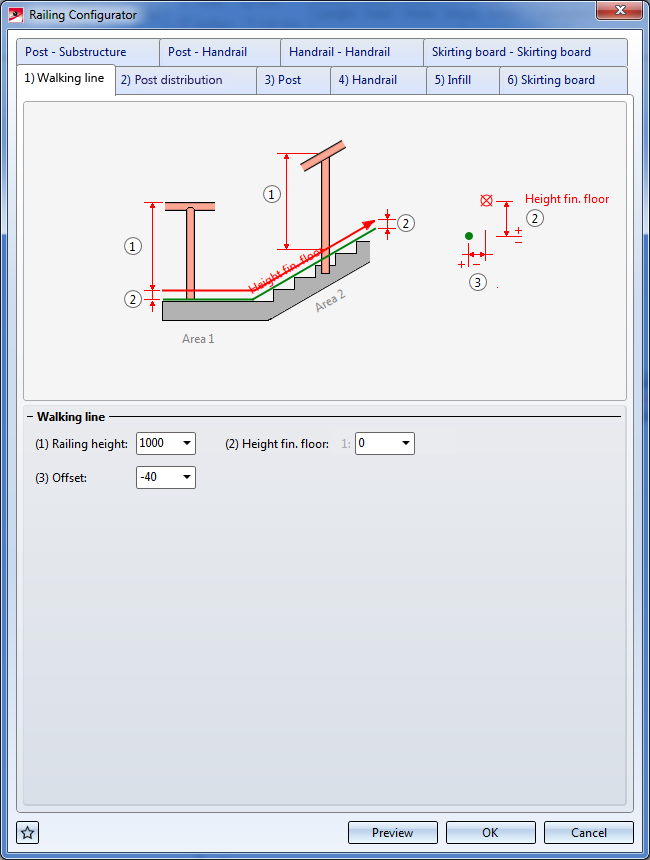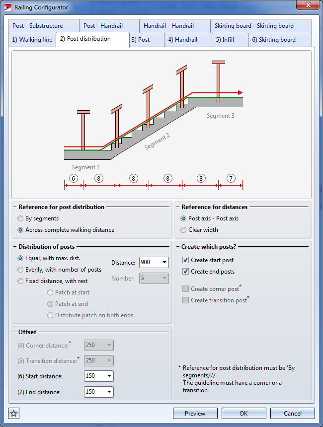 Press the middle mouse button to end identification of beams, which automatically opens the Railing Configurator dialogue window. The operation of the dialogue window is largely identical to that of the Railing Configurator (along beams) function, the only difference being the explanatory graphics in the Walking line and the Post distribution tab.