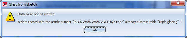 If an entry with the same name already exists in the selected table, you cannot save the glass as a semi-finished product here. In such cases HiCAD will display the following message: