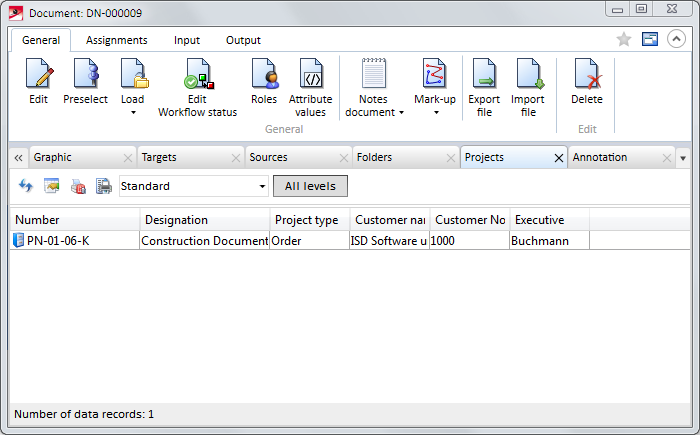 You can call the editing functions for the document via the context menu or via the Ribbon menu in the detail window that consists, similar to the areas of the context menu, of the General, Assignments, Input and Output tabs.
