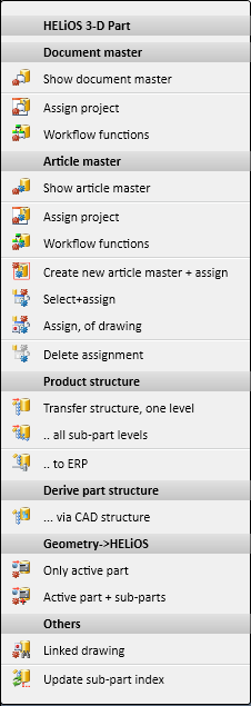 When you right-click a part in the drawing or the part name in the ICN, a context menu will be displayed. Go to the HELiOS menu item to open the HELiOS sub-menu. If, for instance, you right-click a 3-D part, the HELiOS 3-D Part context menu will be displayed: