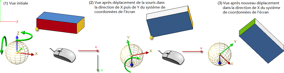 Dans notre exemple, la vue initiale (1) est pivotée par un mouvement de la souris dans la direction de X puis dans la direction de Y (par rapport au système de coordonnées de l'écran) autour de l'axe Z (l'axe qui a la pente la plus forte) et est basculée par rapport l'horizontale de l'écran. Si la vue actuelle (2) est pivotée à nouveau avec la fonction Pivoter la vue dynamiquement autour d'un point 3D, l'axe de rotation reste l'axe Z, alors même que l'axe avec la pente la plus forte est maintenant l'axe Y. En déplaçant à nouveau la souris dans la direction de X, cela provoque à nouveau une rotation autour de l'axe Z (3).