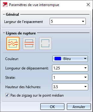 Pour les lignes de rupture en zigzag, la couleur, la strate et le dépassement, ainsi que la hauteur des hachures peuvent être définis. Cocher la case Pas de zigzag sur le point médian permet, lorsque le nombre de zigzag est impair, de disposer les zigzags de telle sorte qu'il n'y en ait pas sur le point médian de la ligne de rupture. Les zigzags seront plutôt déplacés de manière appropriée sur la ligne de rupture. La raison est que les lignes médianes en pointillé se retrouvent généralement exactement sur le point médian de la ligne de rupture. Il est préférable qu'aucun zigzag soit représenté ici. |