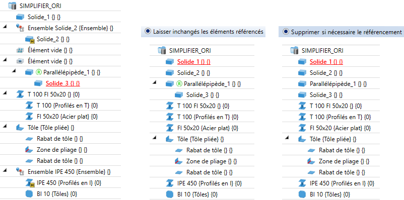 - Les éléments à supprimer ne seront pas seulement supprimés en tant qu'éléments supérieurs, mais également lorsqu'ils sont subordonnés à des éléments à ne pas supprimer (cf. point 2) - par exemple, si un élément vide est subordonné à un solide ou à un élément principal de tôle.