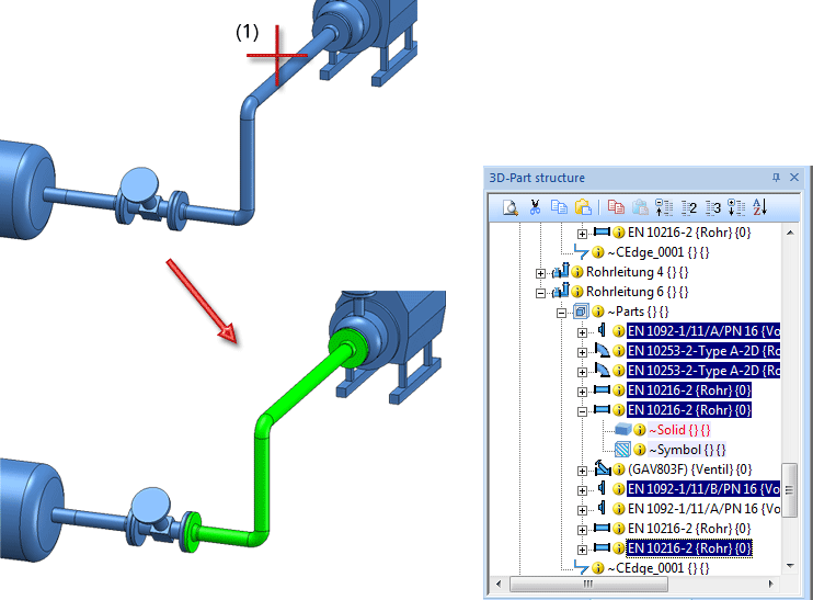 Starting from the connections of the identified part, the belonging further parts will be detected up to the next flange connection or, if no such flange connection can be found in this direction, up to the end of the pipe. The parts that could be detected will be highlighted in the ICN.