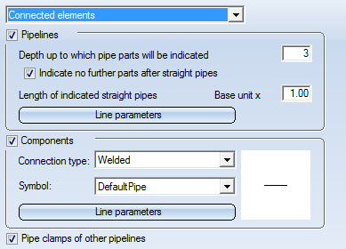 Select the Connected elements entry to specify, separately for pipelines and components (e.g. vessels and pumps), whether and how exact their representation should be. You can switch off the indicating of Pipelines and Components by deactivating the same-named checkboxes.