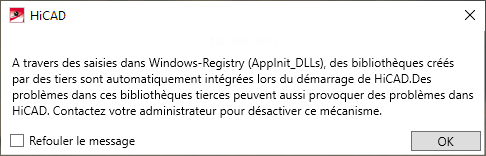 Si vous souhaitez que ce message ne soit plus affiché aux prochains démarrages de HiCAD, activez la case Ne plus afficher ce message. Le cas échéant, veuillez en discuter avec votre administrateur. Le message ne réapparaîtra que dans le cas où la valeur Registry (de l'Éditeur du Registre) a été modifiée ; autrement dit, quand d'autres fichiers DLL auront été chargés ! Pour ré-afficher ce message indépendamment de cette dernière action, il est possible dans le Registry de Windows sous