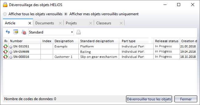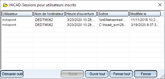 Lors de ce type de plantage système, les Lock-Files ne sont pas retirés des scènes ouvertes pendant l'incident ; autrement dit, les scènes restent verrouillées pour les autres utilisateurs. Au prochain démarrage HiCAD, ces fichiers verrouillés vous seront affiché(e) dans la fenêtre de dialogue Sessions HiCAD....