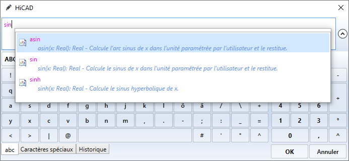 Dès que vous saisissez quelque chose dans le champ de saisie de l'éditeur, HiCAD cherche automatiquement les fonctions dont le nom contient la chaîne de caractères saisie. Si vous tapez par exemple sin, toutes les fonctions dont le nom contient la string sin vous seront proposées.