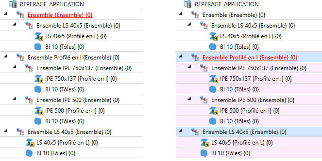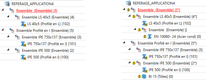 L'illustration de gauche montre la scène à l'origine avec des différents éléments et ensembles déjà repérés (tous les éléments sont pertinents pour la nomenclature. Favori Charpente métallique). Dans l'illustration de droite, la scène d'origine a été modifiée par l'insertion d'une tôle sur le profilé IPE 500. Par ailleurs, l'ensemble LS 40x5 s'est vu subordonner un autre ensemble comme élément secondaire. La tôle et le nouvel ensemble ne sont pas encore repérés.