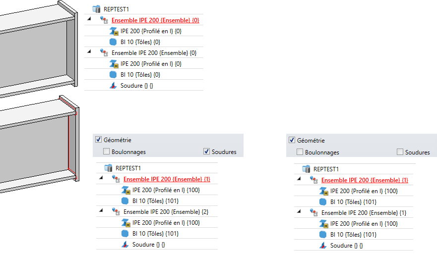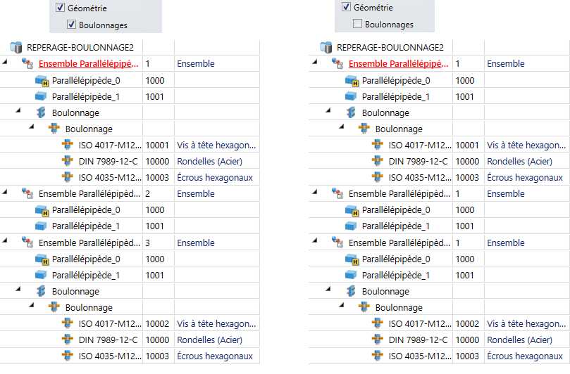 Dans ce mode, les ensembles sont considérés comme identiques lorsqu'ils sont le même élément référé et qu'ils sont géométriquement identiques. Identique géométriquement signifie ici que les ensembles sont également identiques dans leur structure et que les attributs à comparer sont identiques à tous les niveaux. Les numéros de repère (de position) existants des ensembles inférieurs ne sont pas pris en compte.
