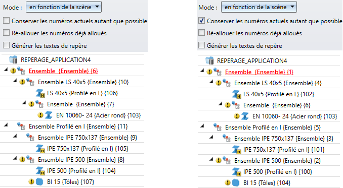L'illustration suivante montre la différence du repérage avec la case Conserver les numéros actuels autant que possible cochée et décochée.