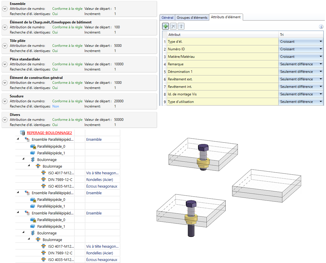 Pour une conception claire et efficace, il convient d'utiliser des ensembles de structuration. Mais cela n'est souvent pas pris en compte dans les "anciennes" méthodes de travail. Dans ce cas, il peut parfois être souhaitable, lors du repérage, de traiter les éléments réguliers (pertinents pour la nomenclature) comme des ensembles, de sorte que leurs éléments secondaires deviennent des sections numérotées séparément. Pour ces cas, vous disposez de la case Traiter les éléments réguliers comme les ensembles dans le Gestionnaire de Configuration sous Compatibilité > Repérage.