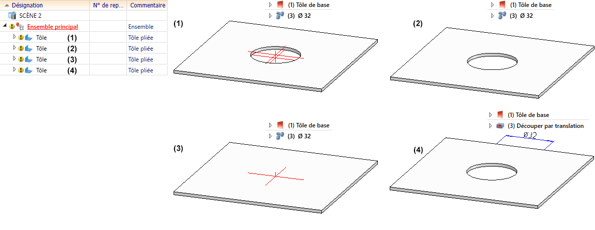 , le perçage 4 avec la fonction Découper l'élément, avec translation