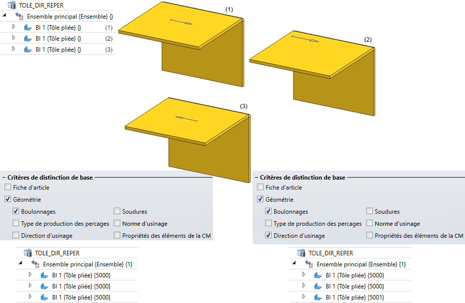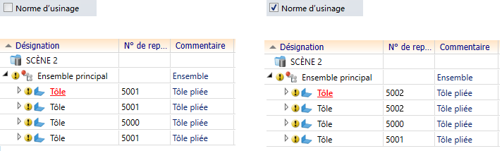 Si la case Norme d'usinage est décochée, les tôles (1), (2) et (4) sont alors considérées comme identiques. Si la case est cochée, alors seules les tôles (1) et (2) sont considérées comme identiques.