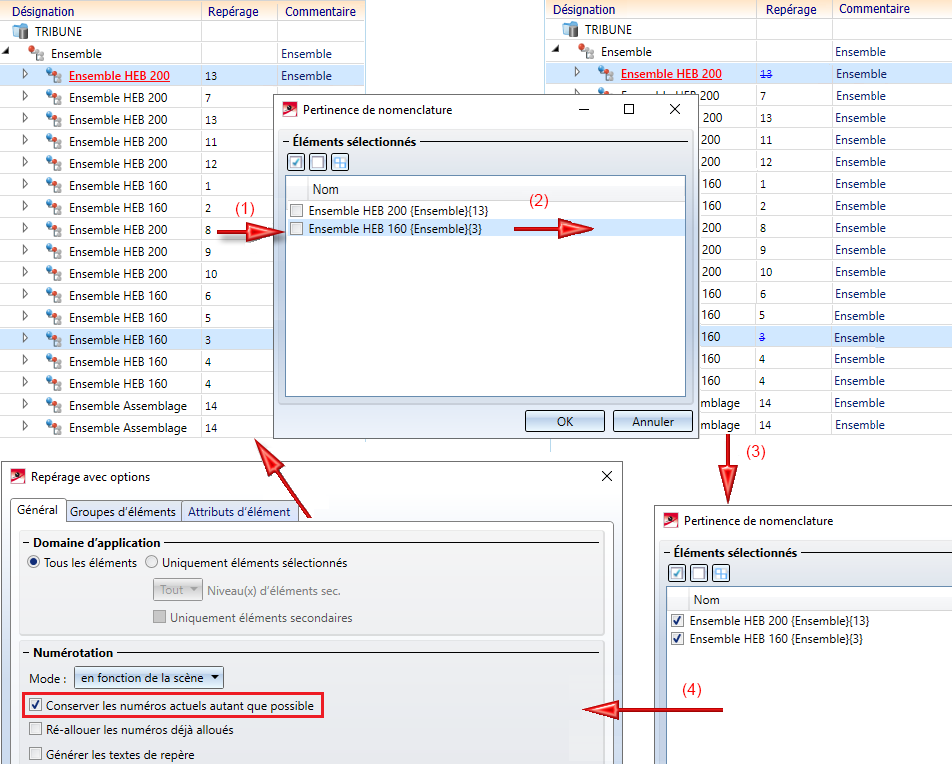 (1) Scène d'origine, (2) Suppression de la pertinence de nomenclature pour les éléments avec les numéros de repère 13 et 3 (clic droit Propriétés > Pertinence de nomenclature). Les numéros de repère 13 et 3 deviennent ainsi invalides. (3) La pertinence de nomenclature est à nouveau attribuée. (4) Le repérage ré-exécuté réinitialise les numéros de repère invalidés.