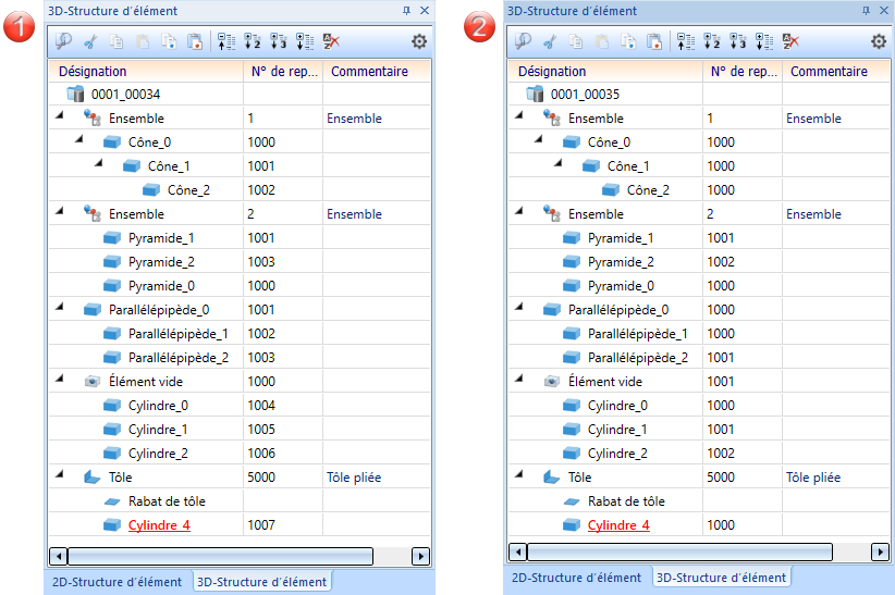 Maintenant, on effectue un repérage avec l'option Uniquement éléments nouveaux et modifiés. L'illustration à gauche montre le résultat sans cocher la case Ré-allouer les numéros déjà alloués. Le numéro de repère 3 (de l'ensemble supprimé) a été ici réattribué. À droite, vous voyez le résultat avec la case cochée.