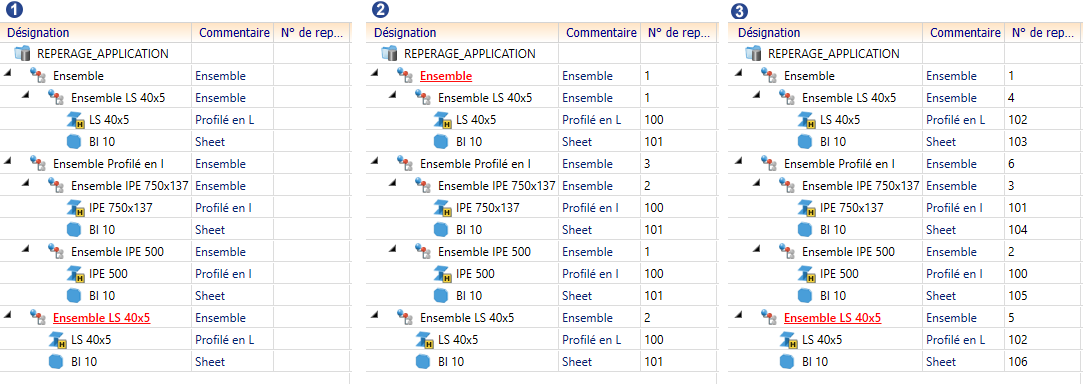 La numérotation se fait consécutivement à l'intérieur d'un ensemble. Il peut arriver que des éléments identiques, présents plusieurs fois dans différents ensembles, se voient attribuer des numéros de repère différents.