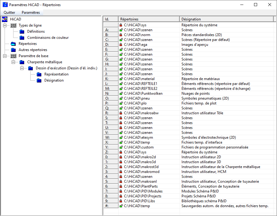 En quittant la fenêtre Paramètres, les répertoires entrés sont conservés même en quittant HiCAD, ils deviennent donc les paramètres par défaut au prochain démarrage de HiCAD. Ces paramètres sont enregistrés dans le fichier FILEGRUP.DAT.