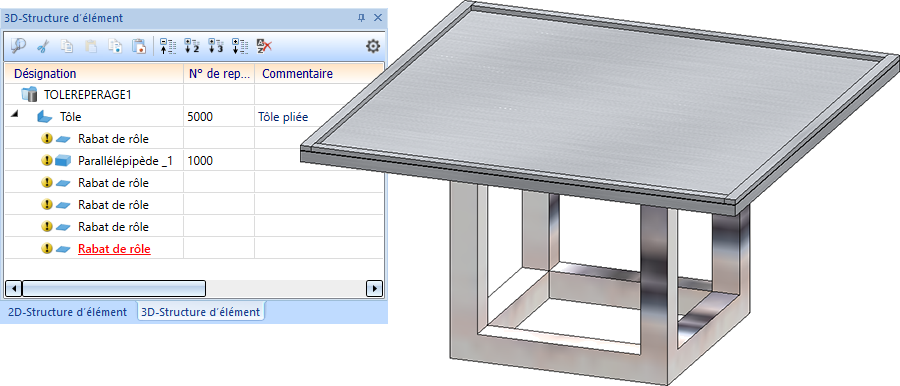 Cela signifie que les éléments qui sont des éléments secondaires d'une tôle pliée sont repérés (s'ils sont pertinents pour la nomenclature). Toutefois, cela ne s'applique pas aux rabats et aux zones de pliage. Ceux-ci ne sont par principe jamais repérés.