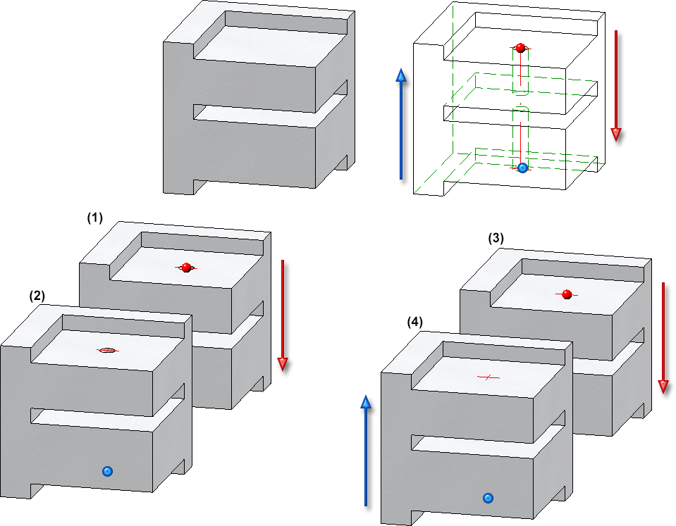 Examinons l'exemple ci-dessous. L'élément y est présent quatre fois sur la scène. Dans les quatre éléments, un perçage débouchant variable a été inséré, qui traverse entièrement la pièce. Les éléments (1) et (3) ont été percés de haut en bas, les éléments (2) et (4) dans l'autre sens. Le point de base est toujours le centre de gravité de la surface d'entrée. Dans (1) et (2), le perçage est représenté exactement, dans (3) et (4) seulement les axes.
