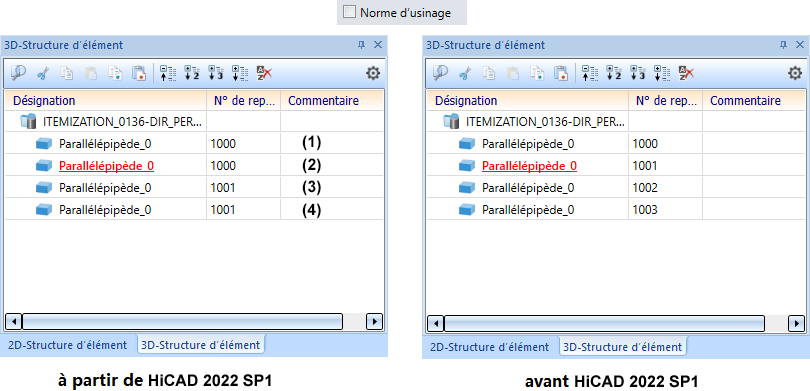 Si cette case est cochée, les éléments réguliers (pertinents pour la nomenclature) seront, pendant le repérage dans HiCAD, traités comme les ensembles et leurs éléments secondaires comme des sections numérotées séparément. La condition est que dans les Paramètres de repérage sous l'onglet Général le mode en fonction des ensembles ou - si un ensemble principal est présent - le mode imbriqué soit sélectionné.