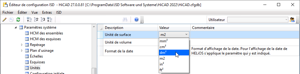 Le décimètre peut également être prédéfini désormais comme unité de surface. La liste de choix correspondante a été complété dans le Gestionnaire de Configuration en conséquence.