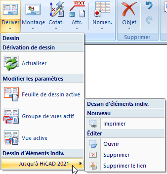 Toutefois, quelques fonctions restantes sont encore utiles dans certains cas pour les anciennes maquettes. Pour cette raison, ces fonctions ont été regroupées dans un sous-menu distinct sous Scène > Repérer/Détailler > Dérivation de dessin > Dessin d'éléments indiv. jusqu'à HiCAD 2021 :