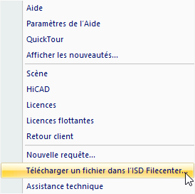 Si, lors d'une demande d'un support technique, vous utilisez le Filecenter de ISD pour l'échange de données, vous avez la possibilité, à partir de HiCAD 2022, de télécharger des fichiers directement depuis HiCAD. À cette fin, vous disposez dans le menu Aide de la nouvelle fonction Télécharger un fichier dans l'ISD Filecenter.
