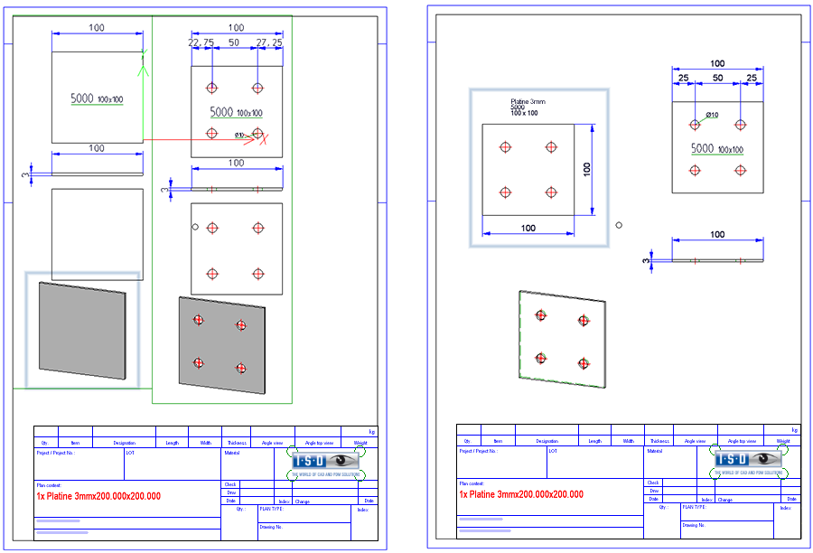 À partir des paramètres indiqués en haut à droite, le dessin sera créé. L'illustration suivante montre à gauche un dessin créé avec HiCAD 2022 et à droite un dessin créé avec HiCAD 2021.
