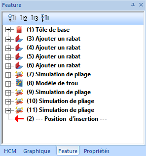 - Si l'élément actif est un élément 3D, alors l'historique de Feature correspondant est affiché dans l'onglet Feature. La technique du Feature n'est disponible que pour les modélisations 3D !