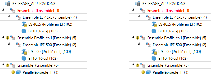 L'illustration de gauche montre la scène à l'origine avec des différents éléments et ensembles déjà repérés (tous les éléments sont pertinents pour la nomenclature. Favori Charpente métallique). Dans l'illustration de droite, la scène d'origine a été modifiée par l'insertion d'une tôle sur le profilé IPE 500. Par ailleurs, l'ensemble LS 40x5 s'est vu subordonner un autre ensemble comme élément secondaire. La tôle et le nouvel ensemble ne sont pas encore repérés.