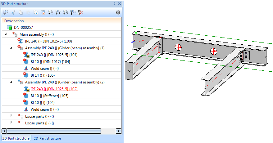 The drawings from our example have been released. Let us assume that you now want to insert two bores into the middle beam that is currently locked against further processing.
