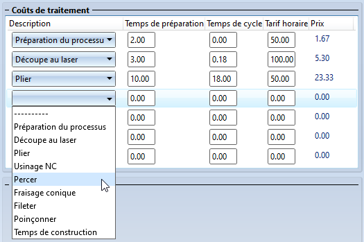 Après avoir effectué le calcul, chacun des paramètres, comme par exemple le prix/kg du matériau et le tarif horaire, peut être directement corrigé dans l'estimateur par un clic dans le champ de saisie. Parmi les coûts de traitement, d'autres traitements/usinages non choisis automatiquement peuvent être ajoutés au calcul, et le prix total s'actualise automatiquement. La liste des traitements/usinages est modifiable dans le Fichier de configuration.