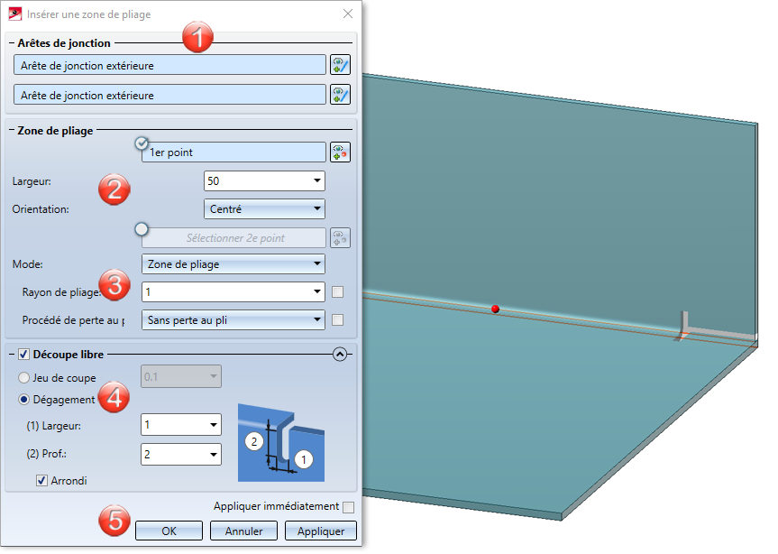 Après avoir saisi toutes les données nécessaires, la nouvelle zone de pliage peut être insérée. En cliquant sur Appliquer ou par un clic sur le bouton du milieu de la souris (BMS), le rabat est élaboré, mais la fenêtre de dialogue reste ouverte, c'est la différence avec le bouton OK. Vous avez ainsi encore la possibilité de modifier les données et par Appliquer de les attribuer à un autre élément de tôle. Si vous quittez la fenêtre de dialogue par Annuler, la fonction sera terminée sans insertion ou modification. Si l'option Appliquer immédiatement est cochée
