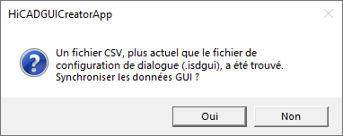 - Si un dialogue utilisateur est ouvert dans l'Éditeur de dialogue HiCAD et que HiCAD détecte que le fichier CSV correspondant est plus récent, un message correspondant apparaît :