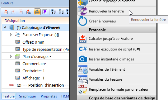 - HiCAD détermine automatiquement si le dialogue utilisateur d'une variante déjà installée a été modifié ultérieurement. Si vous cliquez avec le bouton droit de la souris sur le Feature Calepinage d'élément créé dans le Calepinage d'élément correspondant, la fonction Renouveler la fenêtre est disponible dans le menu contextuel. Cette fonction vous permet de mettre à jour le dialogue utilisateur affiché lors de la modification du Calepinage d'élément.
