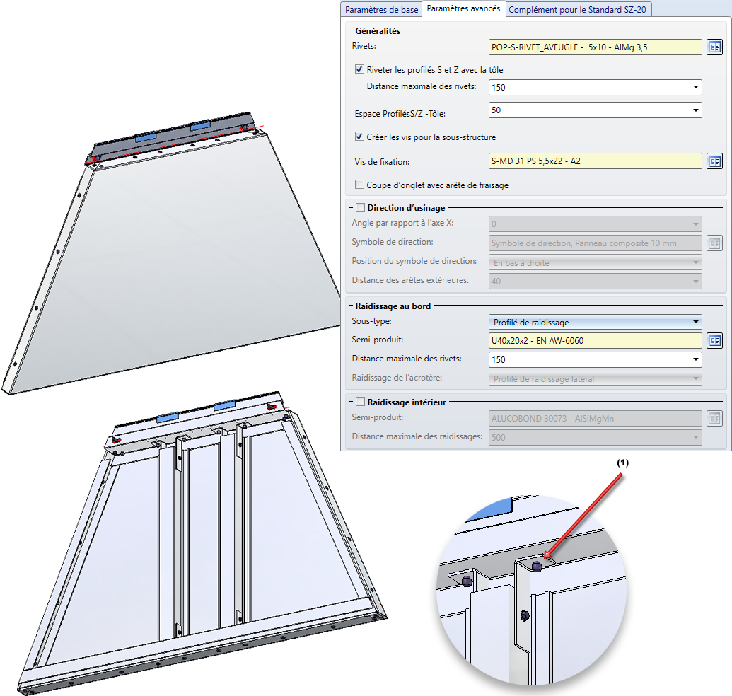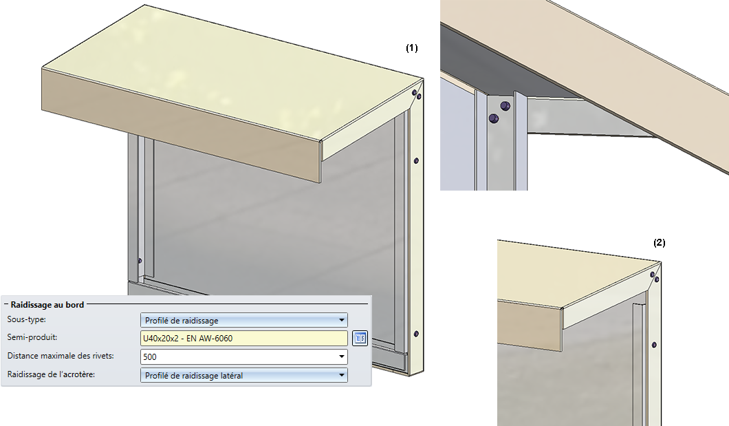 Pour les jonctions d'acrotère, il y a encore la possibilité de prolonger le Raidissage au bord jusqu'à l'acrotère et de le riveter avec les rabats. Sélectionnez pour cela sous Raidissage de l'acrotère le paramètre Profilé de raidissage latéral.