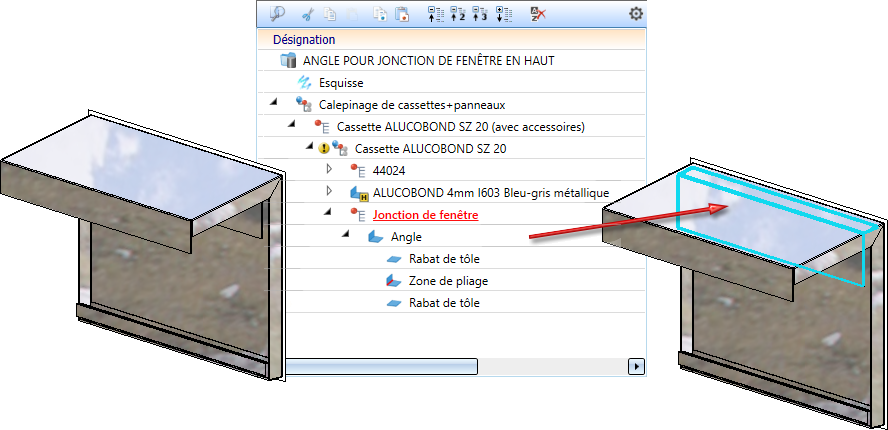 En sélectionnant pour le calepinage de cassettes ALUCOBOND® SZ 20 sous Coupe verticale pour la Jonction, en haut l'option Jonction de fenêtre/appui, un angle de fixation sera alors inséré en supplément.