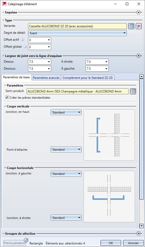 Dans cet onglet, vous sélectionnez le semi-produit de votre choix, ainsi que les paramètres pour la jonction en haut, à sa base, à gauche et à droite. Vous pouvez par ailleurs ici choisir si les pièces standardisées (pour la fixation) devront être insérées ou non. Par défaut, les pièces standardisées devront être créées, la case correspondante est donc cochée. En décochant la case, les pièces standardisées ne seront pas incluses dans la nomenclature.