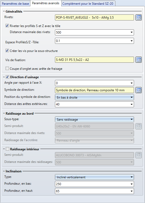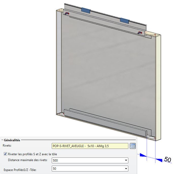 Si les profilés en S et en Z (profilés de suspension) doivent être rivetés avec la tôle, cochez alors la case correspondante et déterminez la distance maximale des rivets.