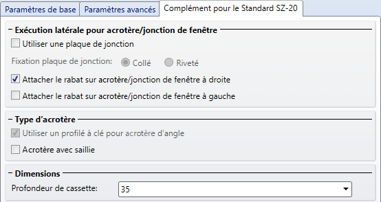 Pour le type de jonction Acrotère long / Acrotère court, le type de rabats latéraux peut y être spécifié. En outre, il est possible de préciser si l'exécution de l'acrotère d'angle doit avoir lieu avec ou sans profilé à clé et vous pouvez indiquer la profondeur de la cassette (qui vaut pour tous les côtés).