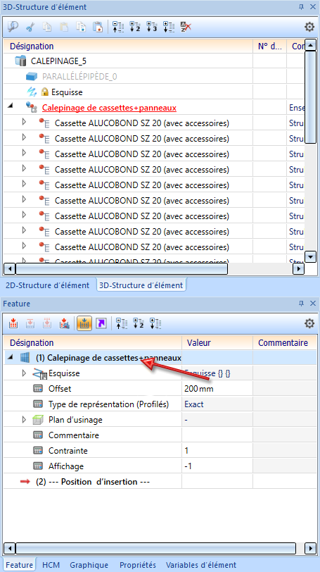 La modification d'un calepinage d'élément s'effectue par un double-clic sur l'entrée correspondante dans l'historique de Feature de l'ensemble Calepinage d'élément. Par ce biais, vous pouvez modifier les éléments de calepinage et supprimer ou encore ajouter d'autres éléments de calepinage.