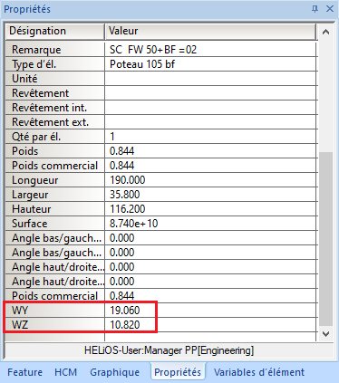 Les données géométriques telles que les moments d'inertie (IY, IZ) et les modules de résistance (WY, WZ) sont reprises par HiCAD en tant qu'attributs et affichées dans la fenêtre Propriétés de l'ICN.